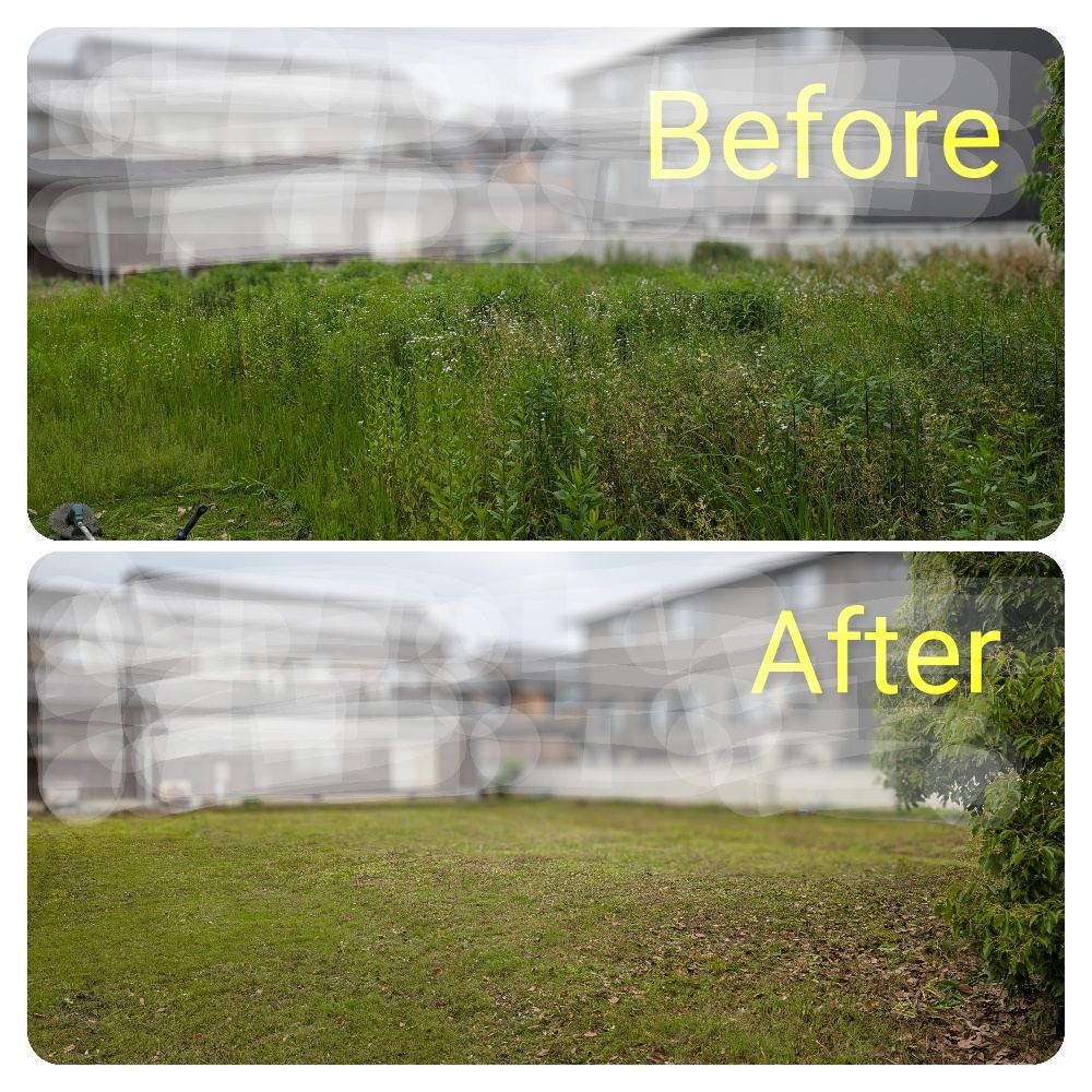 草刈り作業後のBeforeAfterになります。本作業は、草刈り→草の処分→除草剤散布を行いました。年1度程作業させて頂いております。毎年ご用命頂き誠にありがとうございます。