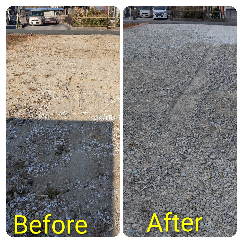 土質の地面から砂利への作業。余計な草を根から除去し、砂利を約5cmで全体へ散布。その後プレート(地面を均す専用機器)で均等に転圧。2日間の作業工程で行いました。ご依頼頂きありがとうございました。