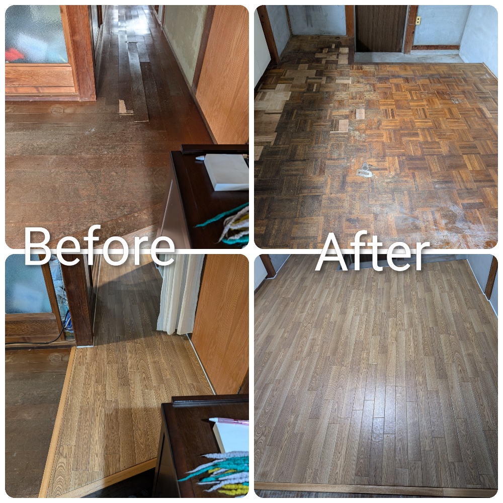長らくお住まいになっているお宅で、床の鳴り沈みにお困りでご依頼がありました。予算とご相談の上施工範囲を調整。床の張り替え→クッションフロアの施工を実施。ご好評・ご用命頂き誠にありがとうございました。
