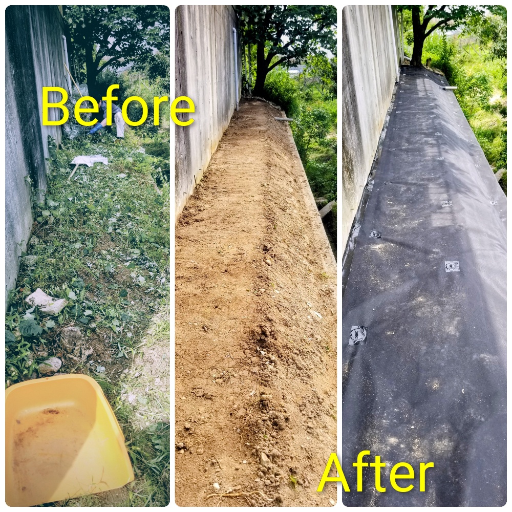 雑草が隣り近所へ伸びてしまいお困りとのことでご依頼を受けました。幅1m、奥行き約10mの草抜き作業。丁寧に伸びた草を処理し、草がほぼなくなる所まで綺麗に処理するのが草抜きの作業依頼でのメインになります。防草シートの施工が難しい場所はこういった作業も、もちろんお受け致しますのでお気軽にご相談ください。ご用命ご依頼頂きありがとうございました。