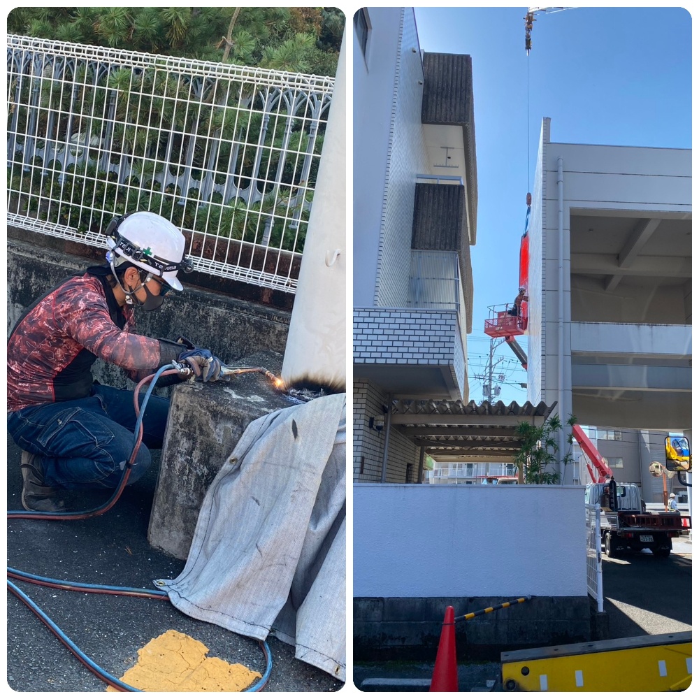 看板の撤去作業のご依頼を受けました。建屋に取り付けられている縦看板、地面コンクリートから長さ約8メートル程の看板撤去を行いました。縦看板はラフタークレーンで吊り上げながら看板内のボルトを各種取り外し、錆びが酷い箇所は専用工具で切除、地面コンクリートからの看板は、コンクリート部分でガス切断にで切り離し作業終了。各所に安全誘導員を配置し安全最優先で作業を終えました。ご用命、ご依頼頂きありがとうございました。